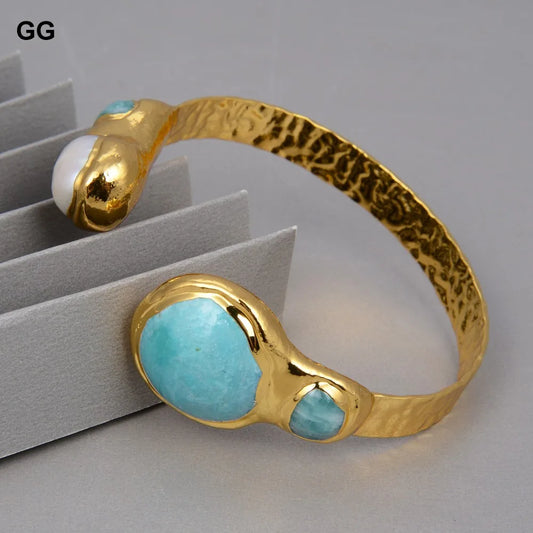 GuaiGuai Jewelry Natural White Pearl Green Amazonites Gold Color Plated Bangle Bracelet