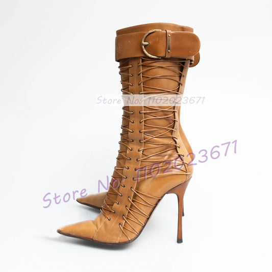 Tan Leather Pointed Toe Mid-calf Boots