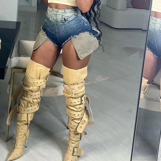 Metal Stiletto Heels Thigh-High Boots- Buckles Straps