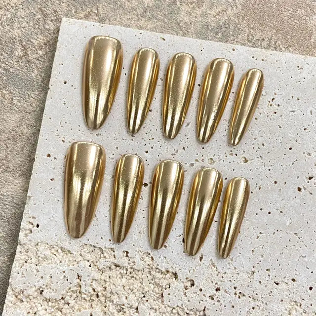10Pcs Handmade Almond Press on Nails Champagne Gold Design