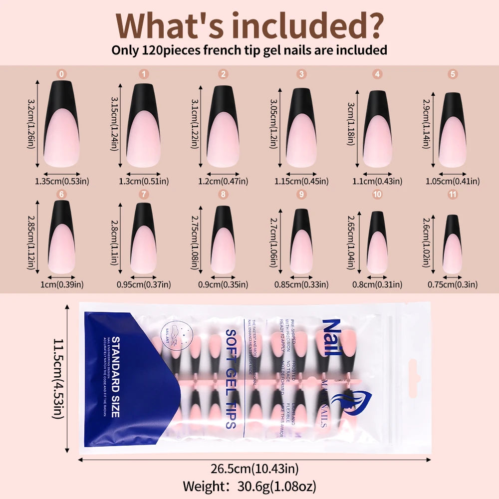 These 120PC Black French Gel Nail Tips offer a stunning matte finish and are perfect for achieving a long coffin shape. With 12 different sizes and a total of 120 pieces, this set provides endless possibilities for creating beautiful and natural looking nails. Whether you are a professional nail artist or just love to do your own nails, these tips are sure to enhance your nail game. Made from high quality acrylic material, these full cover tips are both durable and easy to apply. Perfect for creating French tips or adding decorative elements, these tips are compatible with both acrylic and UV gel. Get ready to elevate your nail game with these versatile and stylish False Nail Tips.