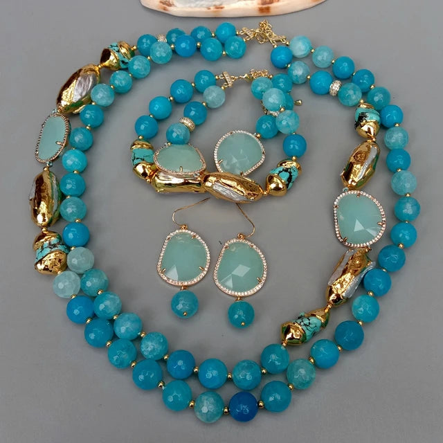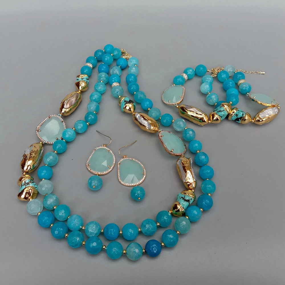 2 Rows Blue Faceted Agate Turquoise Cultured White Biwa Pearl Crystal Necklace Bracelet Earrings Set