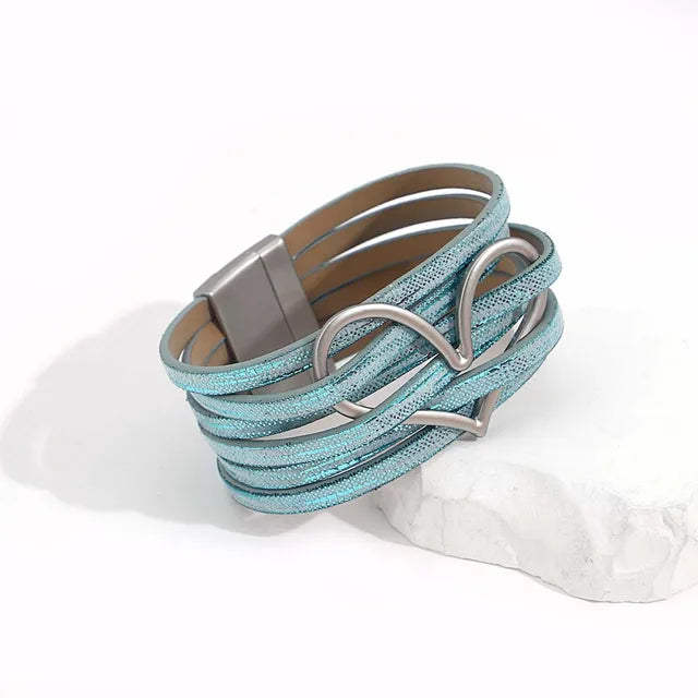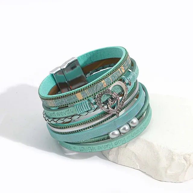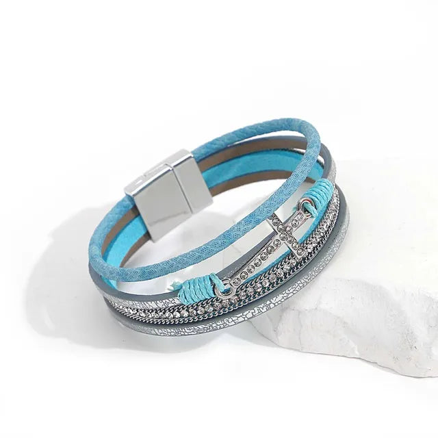 This exquisite ALLYES Boho Blue Multilayer Braided Leather Bracelet is the perfect accessory for any woman. Its charming heart, cross, evil eye, and pearl details make it a true statement piece for any party or special occasion. The intricate design and high-quality materials make it even more desirable. Elevate your jewelry collection with this must-have bracelet!