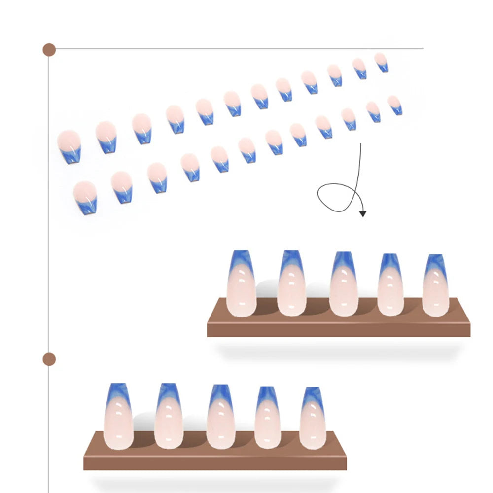 Transform your nails into a work of art with our Fashion Ballerina False Nails Set! This DIY manicure kit features stunning blue blooming French tips, designed to inspire your creativity and elevate your look. Each set comes with 24 full cover coffin fake nail tips, all adorned with intricate designs for a touch of elegance. Made with high-quality plastic, our false nails are detachable and wearable, making them the perfect choice for any occasion. Give your hands the beauty treatment they deserve with our Fashion Ballerina False Nails Set. Add them to your collection today!