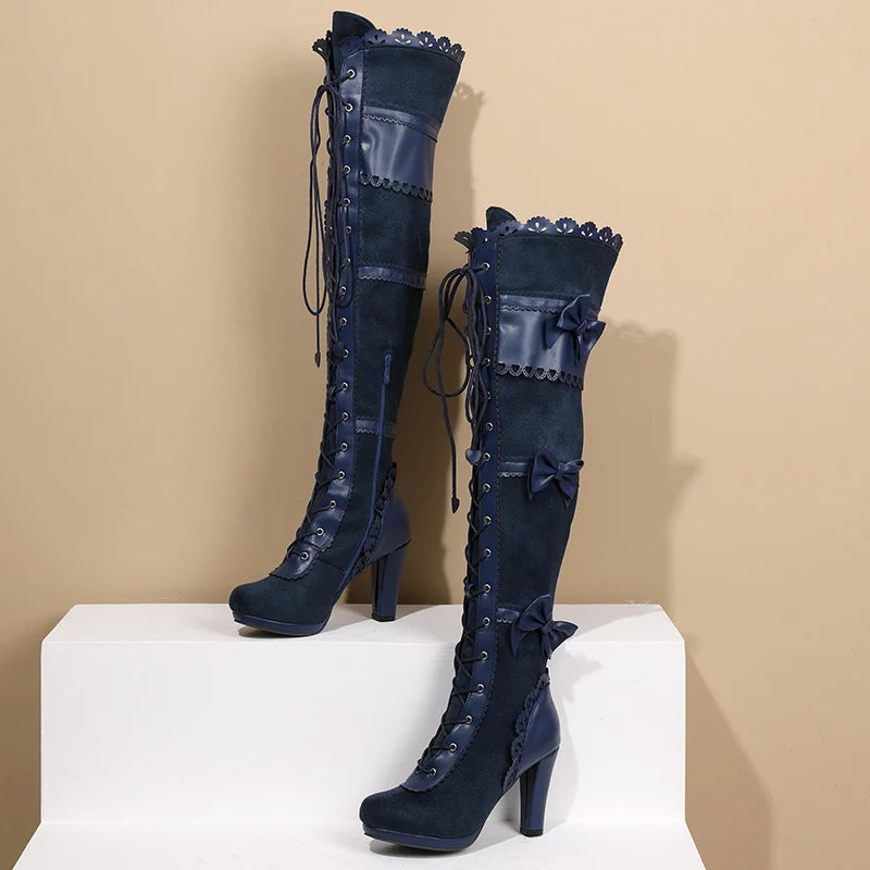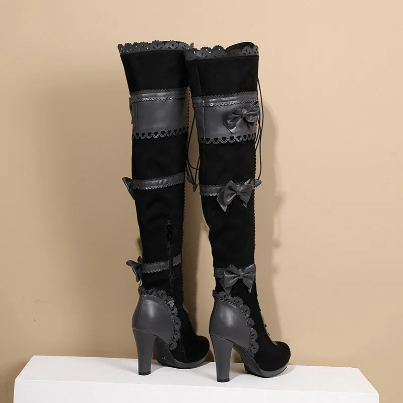 Indulge in luxurious style and comfort with the Flock Stitching PU Super Thick Heel Cute Bow Women's Over-The-Knee Boots. These winter boots feature a Lolita style with a beautiful butterfly-knot design, creating a sense of allure and elegance. The plush inner lining will keep your feet warm and cozy, while the side zipper and cross lace add a touch of edgy sophistication. Handmade with high-quality materials, these modern boots are perfect for any occasion and will make you feel confident and stylish with every step. Order now and experience the beauty and functionality of the ENMAYER brand.