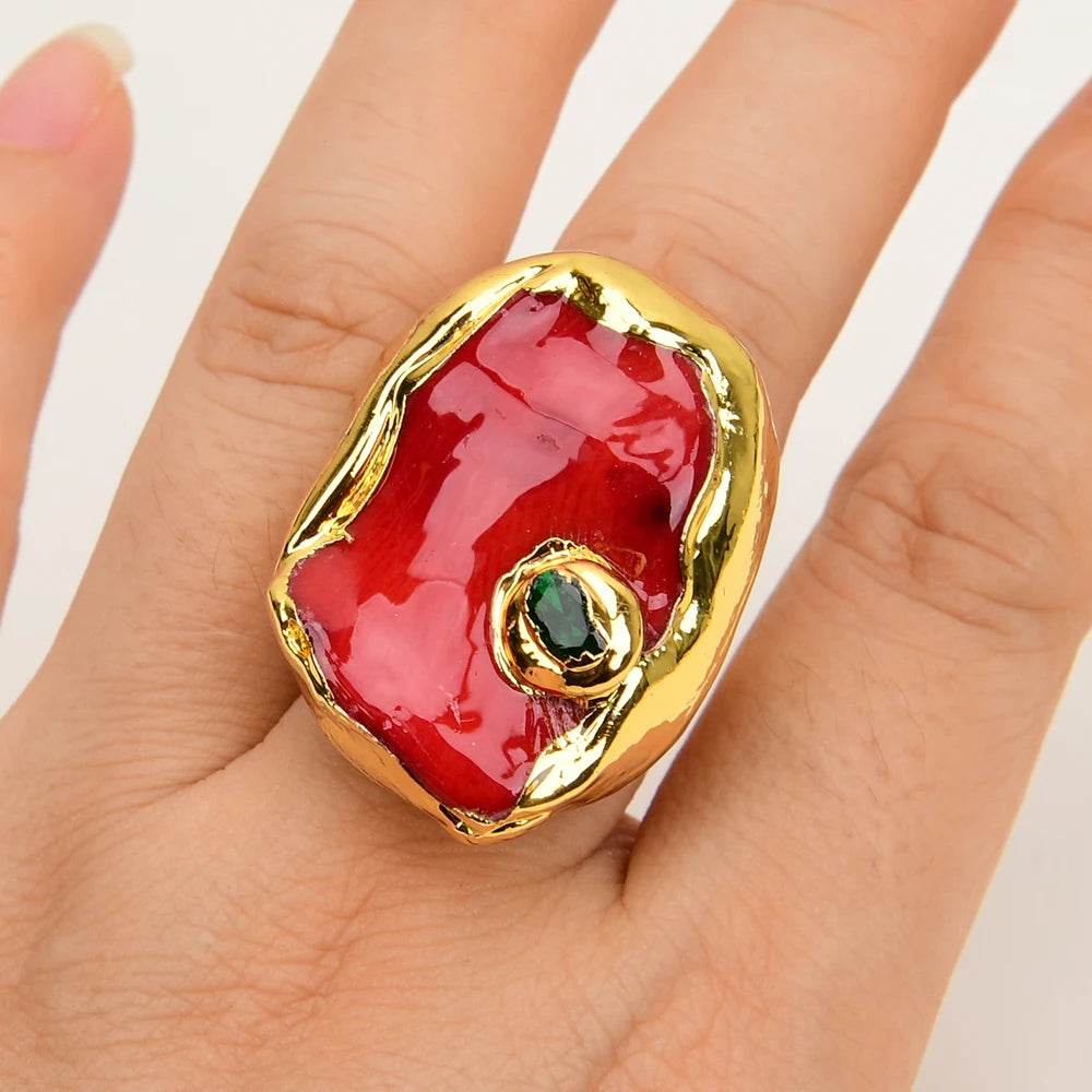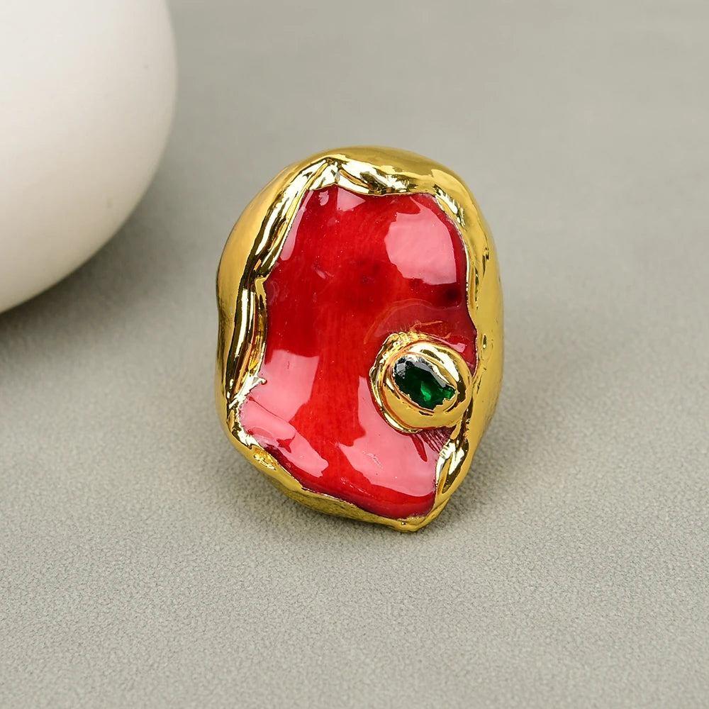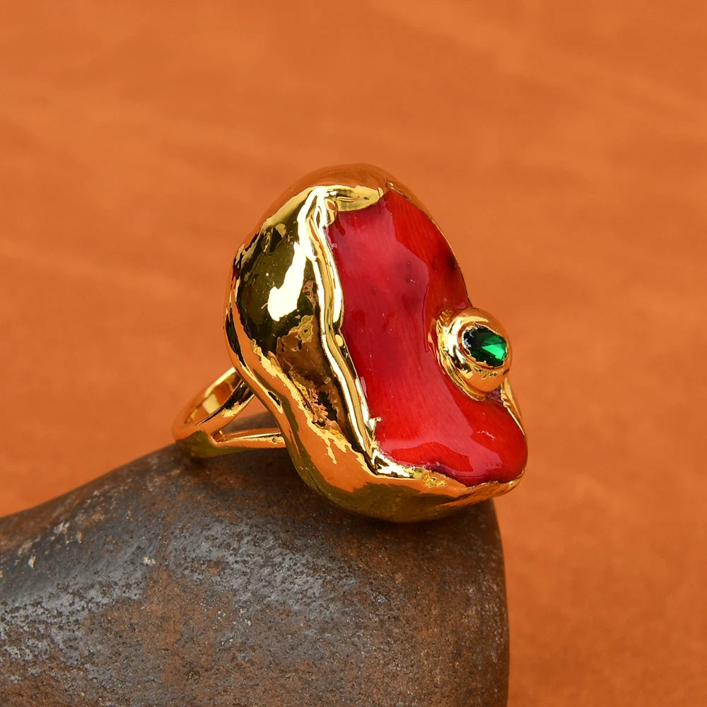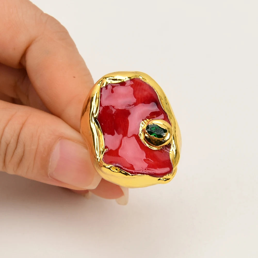Experience the exquisite beauty and power of nature with our G-G Natural Red Coral Nugget Green Crystal CZ Pave Rings. Handmade with passion and precision, these rings feature a stunning coral design surrounded by sparkling crystals and a gold-plated edge. Adjustable to fit any size, these rings are perfect for any occasion - from parties to fitness tracking. Made with quality stainless steel, these rings are durable and suitable for all compatible devices. Add a touch of nature and elegance to your style with our G-G rings. Shop now at AIPIAODEGUAIGUAI.