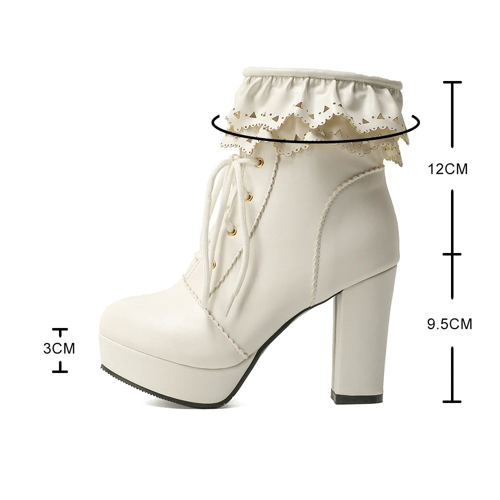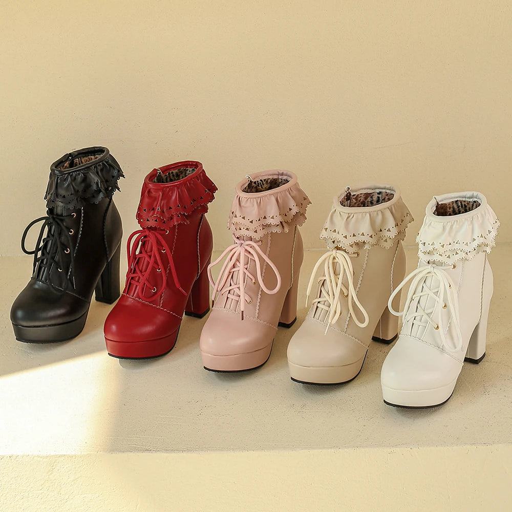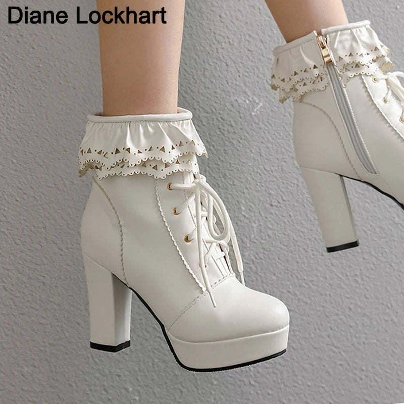 Embrace your love for fashion with these Diane Lockhart Lace Up Ankle Boots! These stylish boots feature a sweet and cute lace design with a Lolita twist, and are perfect for cosplay or everyday wear. They boast a platform height of 0-3cm for a comfortable fit, and are handcrafted with high-quality PU material. The solid pattern and round toe shape add a touch of elegance, while the super high heel (8cm+) and squared heel type make these boots irresistible. Plus, with a convenient zip and durable rubber outsole, you'll never want to take these boots off. Available in a range of sizes, including plus size 43. Don't miss out on these must-have boots from Diane Lockhart.
