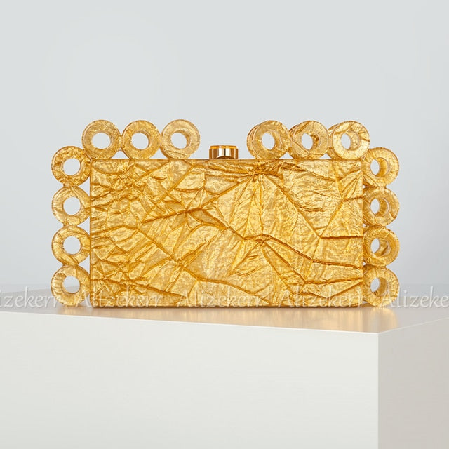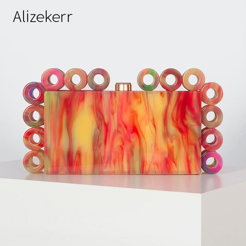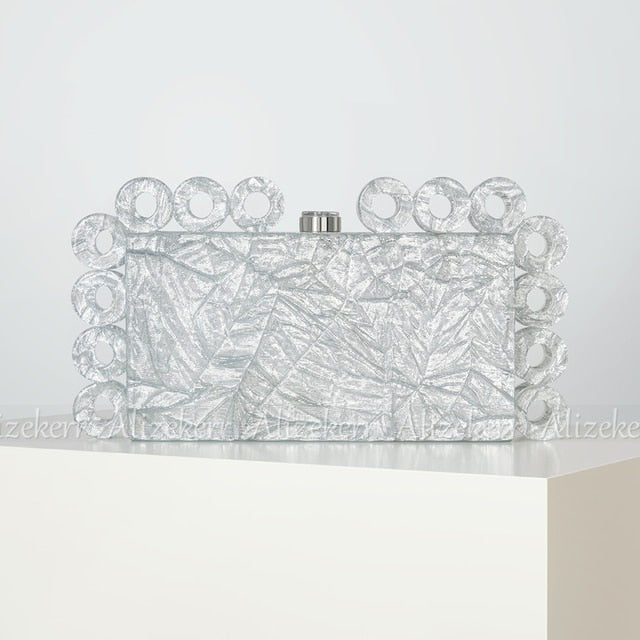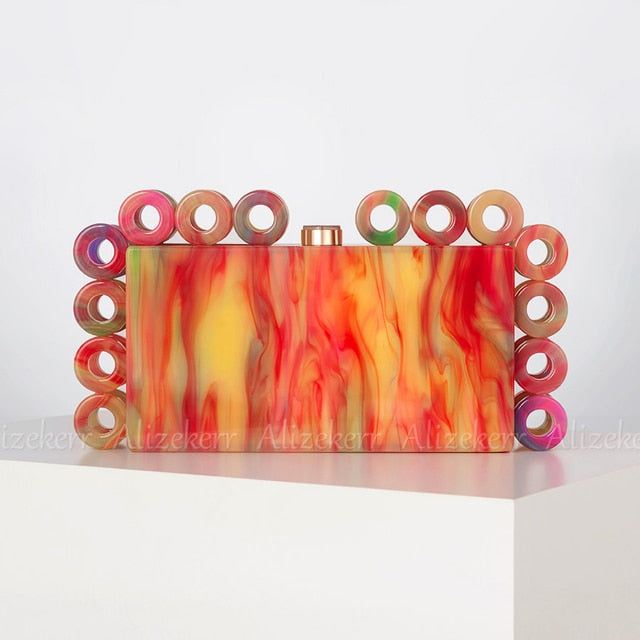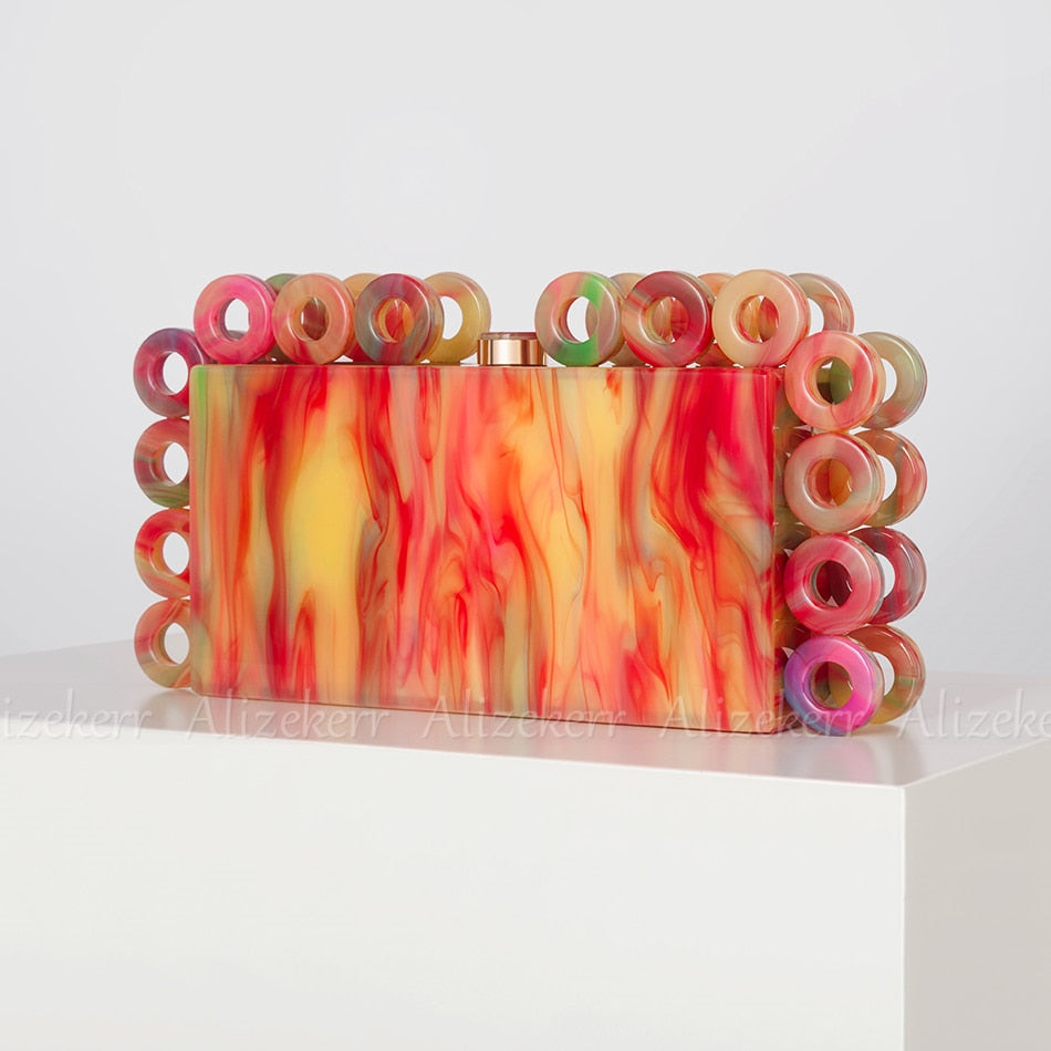 Make a powerful statement with the Marbling Acrylic Box Evening Clutch! It's perfect for your next wedding, party, or special event, and the small ring decoration offers an elegant touch of sophistication. Made with marbled acrylic, this clutch bag offers a unique look for any occasion. Wow your guests with style!