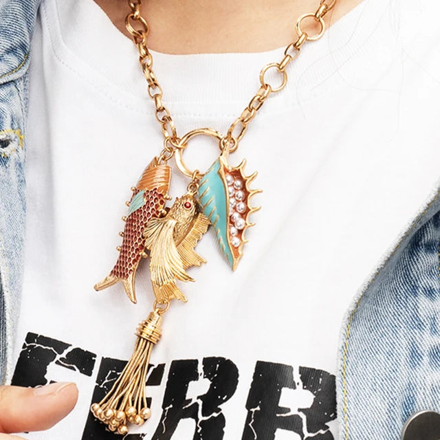 Get ready to elevate your fashion game with this Marine Fish Fashion Choker Necklace Layer. Perfect for any occasion, this trendy jewelry piece from WealthyBoo Fashion Jewelry is a must-have for stylish ladies. With its chic design and eye-catching pink pendant, this necklace will add a touch of mermaid-inspired magic to your look. Crafted with environmental zinc alloy and enamel, it's gentle on even the most delicate skin. Whether you're treating yourself or shopping for a gift, this statement necklace will make a memorable and stylish present. Don't miss out on this exquisite piece!