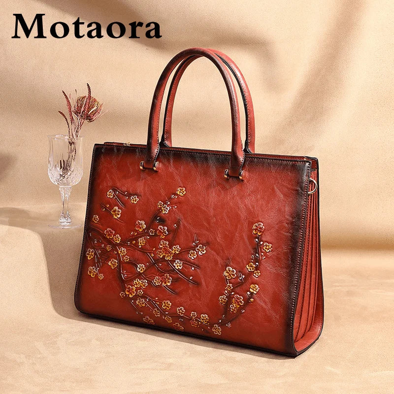 Discover the MOTAORA Vintage Embossed Leather Top-handle Bag, designed for women who value both style and practicality. This large-capacity shoulder and handbag features a beautiful floral embossed pattern and a sturdy split leather build. With multiple interior pockets—including slots for your phone, zipper compartments, and a computer interlayer—organization is effortless. Its hard structure and secure zipper closure ensure your belongings stay protected. Perfect for any occasion, this vintage-inspired tote combines timeless elegance with everyday functionality. Elevate your accessory collection with this versatile and chic leather bag.