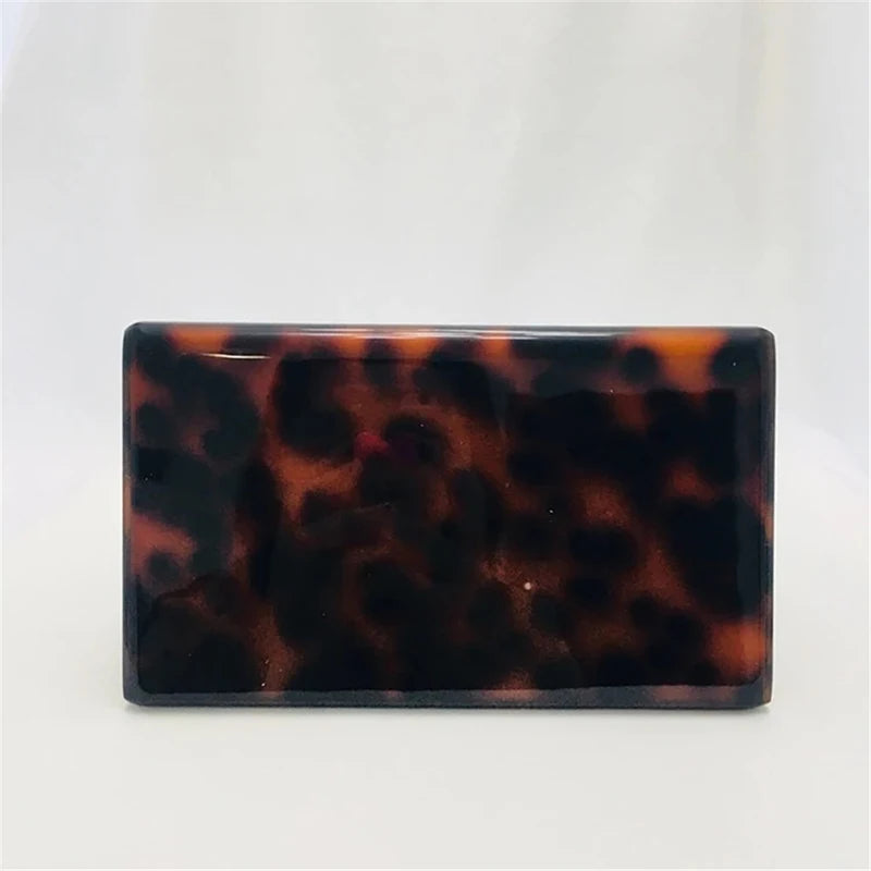 This versatile acrylic evening bag boasts a striking black amber leopard print and a luxurious designer style that will make any woman feel like a queen. With a sturdy clasp closure and a hard exterior, this clutch purse is perfect for weddings, bridal parties, proms, or any special occasion. The PVC lining and spacious interior without any pockets allow for ample storage space. Take on a vintage look with this box-shaped, top-handle tote that is adorned with subtle leopard patterns. Experience the elegance and sophistication of this Cirmation handbag, which is sure to turn heads wherever you go.