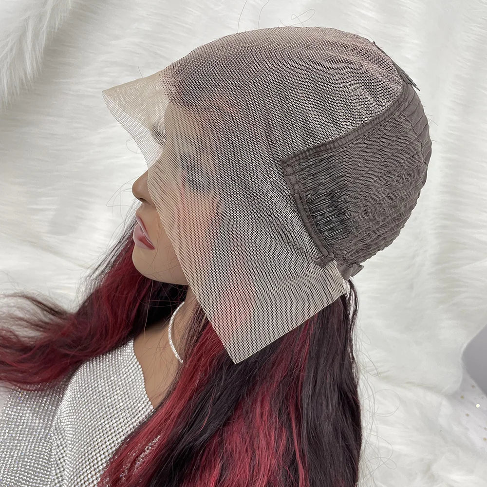 Elevate your style with the NY Hair Highlight Wig, made from 100% human hair. Featuring a stunning up to 32inch length and stretchable design, this wig is the perfect choice for a bold and beautiful look. The 1B 99J Burgundy color adds a touch of sophistication, while the body wave texture adds volume and movement. The lace front and HD lace frontal provide a flawless, natural-looking hairline, making this wig a must-have for any woman. Don't miss out on this colorful and high-quality wig option!