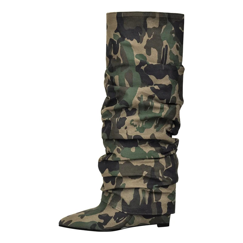 Experience the ultimate blend of style and comfort with Onlymaker's Camouflage Winter Boots! These knee-high boots feature a pointed toe, a wedge high heel, and a pleated design for a fashionable and unique look. Available in a range of sizes, including big sizes for all women.