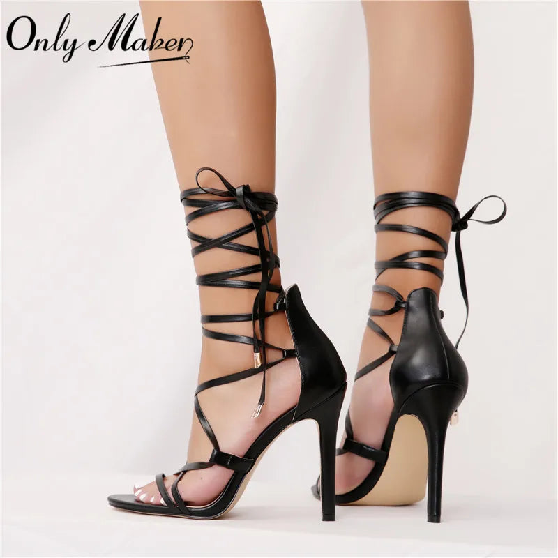 Elevate your style with these onlymaker Women Stiletto Sandals. Designed with a confident 12CM heel and open toe, these black ankle strap sandals exude a captivating energy. The PU lining and patent leather upper material add a touch of luxury, while the strappy design creates a bold and fashionable statement. Perfect for parties and special occasions, these sandals fit true to size and feature a sleek lace-up closure. Make a statement and turn heads with these must-have heels from Onlymaker!