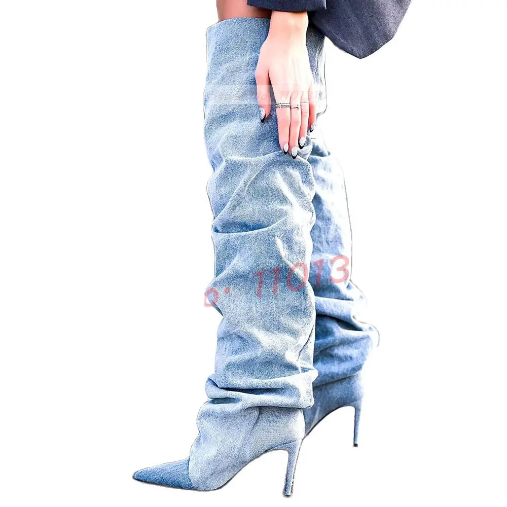 Pointy Denim Thigh High Boots