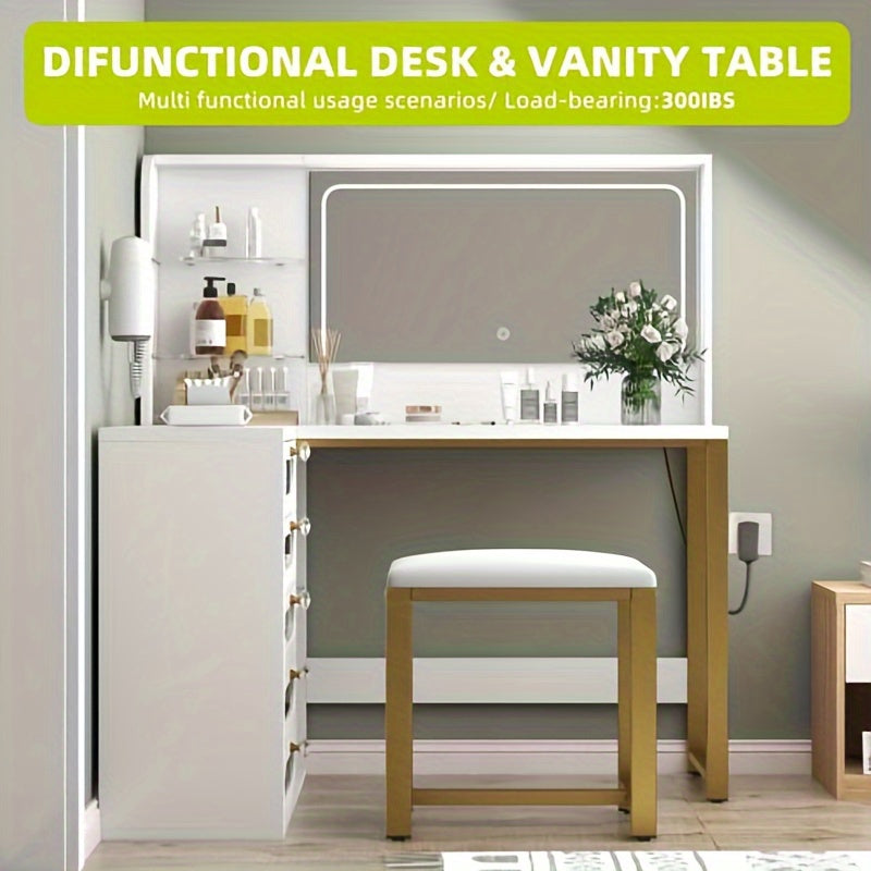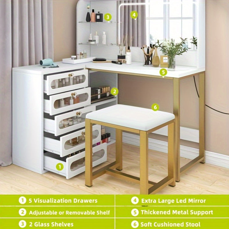 Cozrex 47" L-Shaped Corner Makeup Vanity Desk with Lights and Mirror
