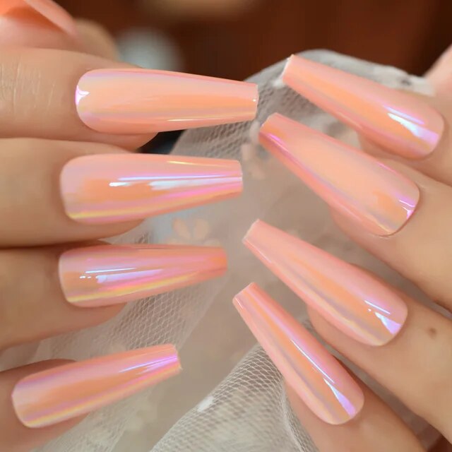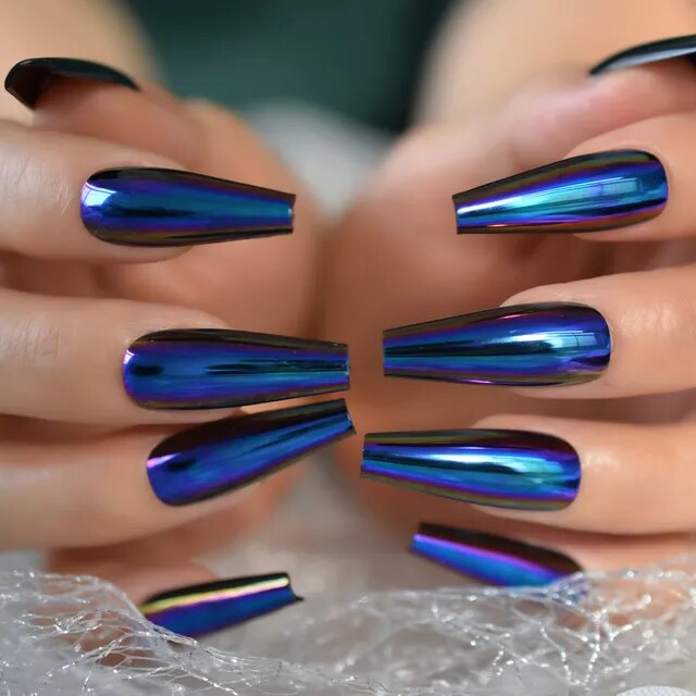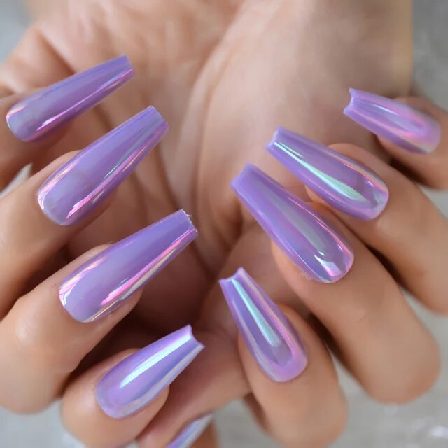 Enhance your look with these silver glitter coffin nails. Nails come in a pack of 24 and are composed of healthy ABS material for a durable and stylish effect. The extra long design and cool style makes them perfect for party or night club to achieve an impressive and eye-catching result. With 1 sheet of glue sticker included, DIY nail art is easy and fun to do with friends.