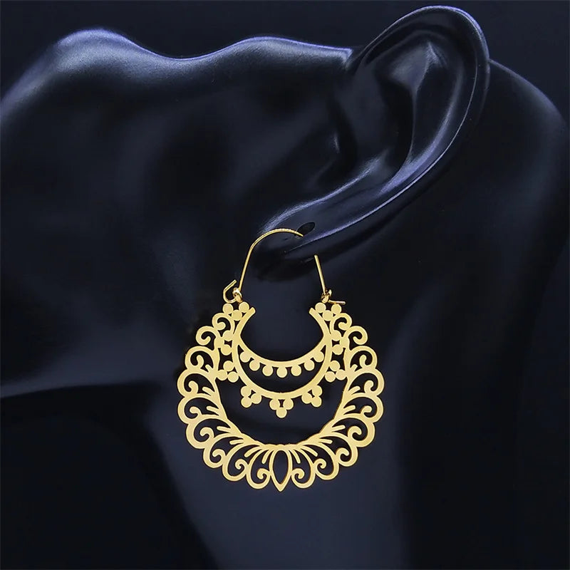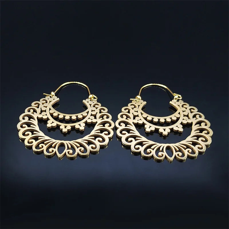 Stainless Steel Gold Color Big Flower Circle Earrings - Boho Jewery