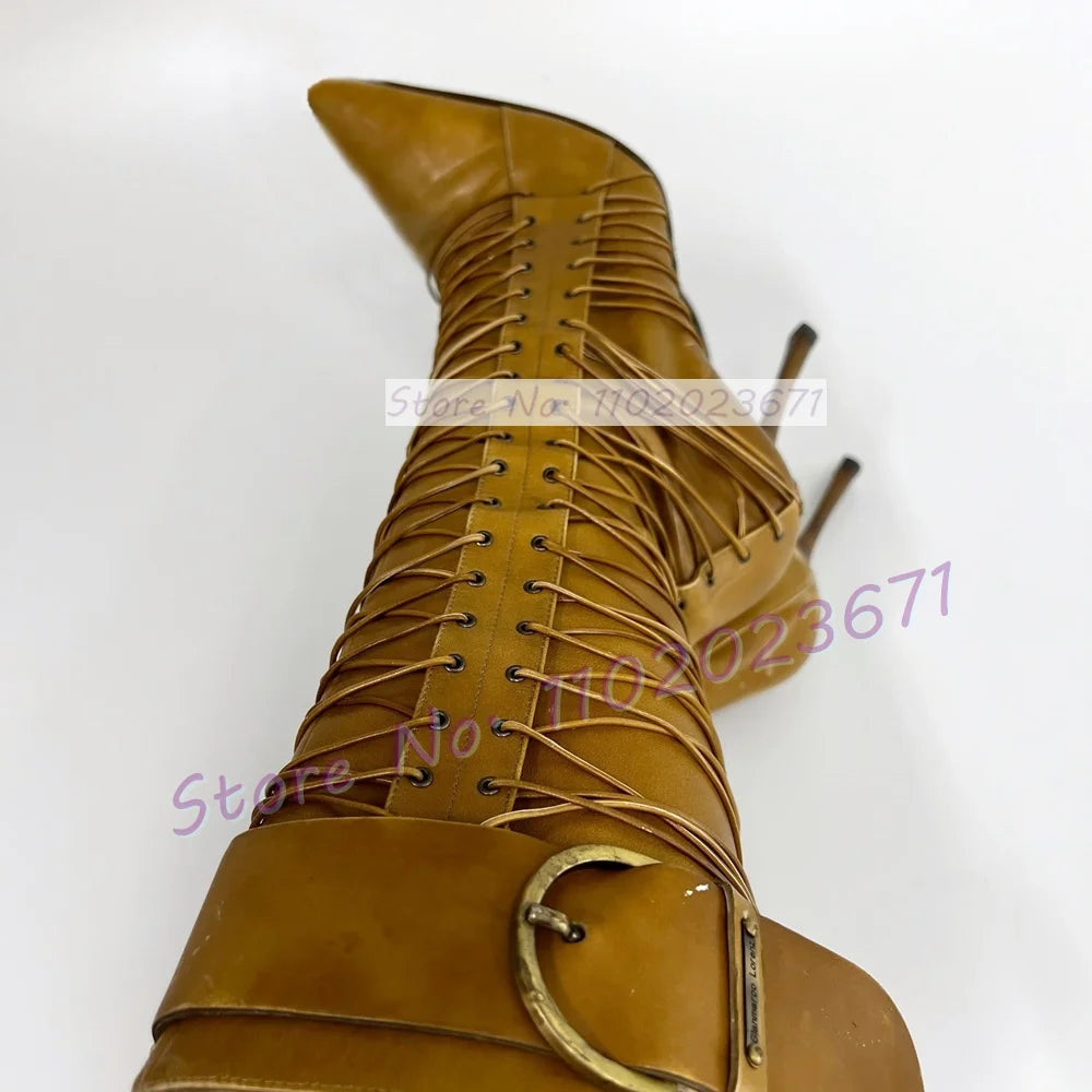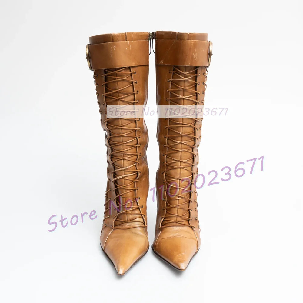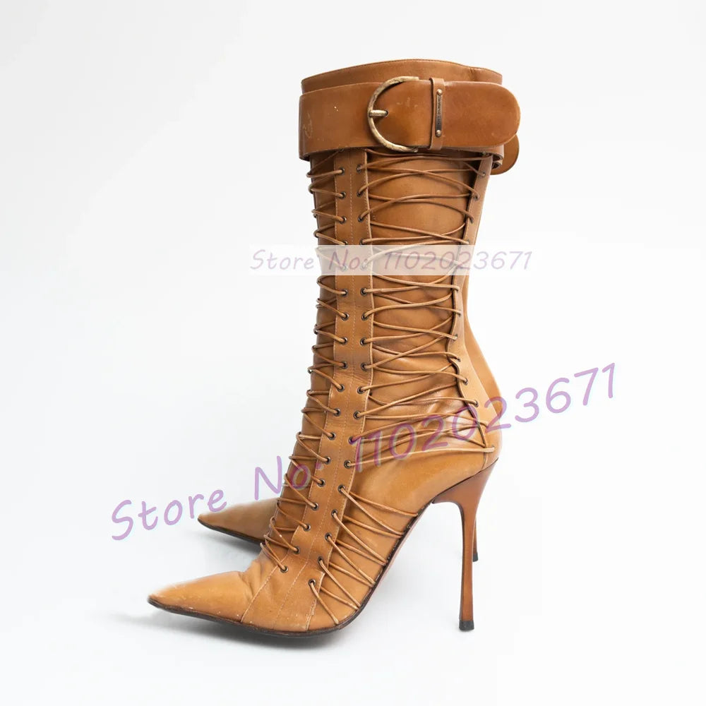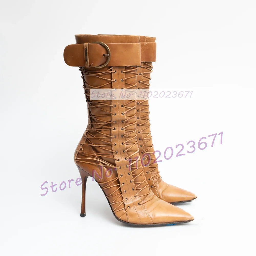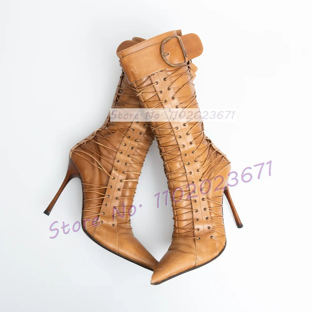 Experience the ultimate combination of style and functionality with these Tan Leather Pointed-Toe mid-calf Boots. Indulge in the luxurious leather material, modern pointed-toe design, and trendy lace-up detail. Complete your look with the cool belt buckle strap and cross-tied tall boots. Elevate your fashion game with these must-have shoes for stylish divas.