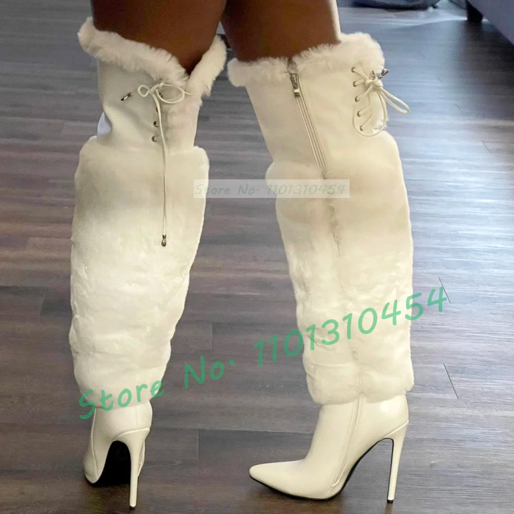Transform your winter wardrobe with these chic White Fur Wrap Over-knee Boots! With their fuzzy texture and luxurious fur, these boots will elevate any outfit. The trendy pointy high heels add a touch of elegance while the lace-up design creates a snug fit. Available in sizes 35-46 and in classic black, these boots are a must-have for any fashion-forward woman. Don't miss out on this must-have winter accessory! Item No: AL047 Color: as pictures.