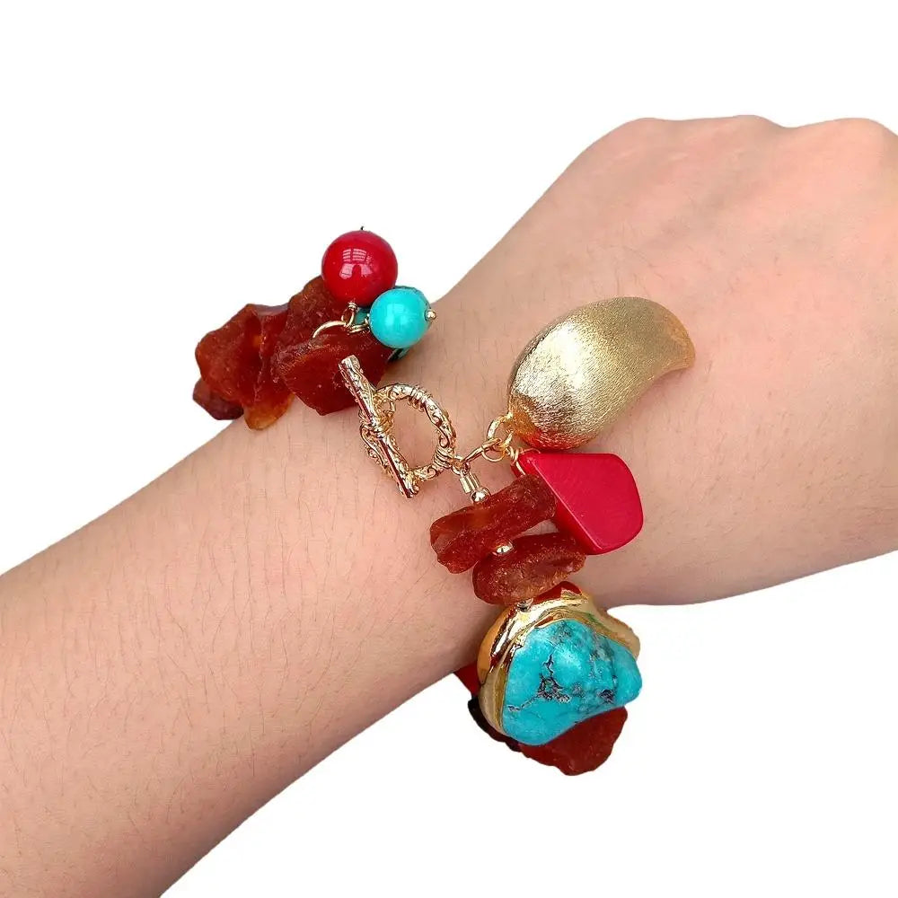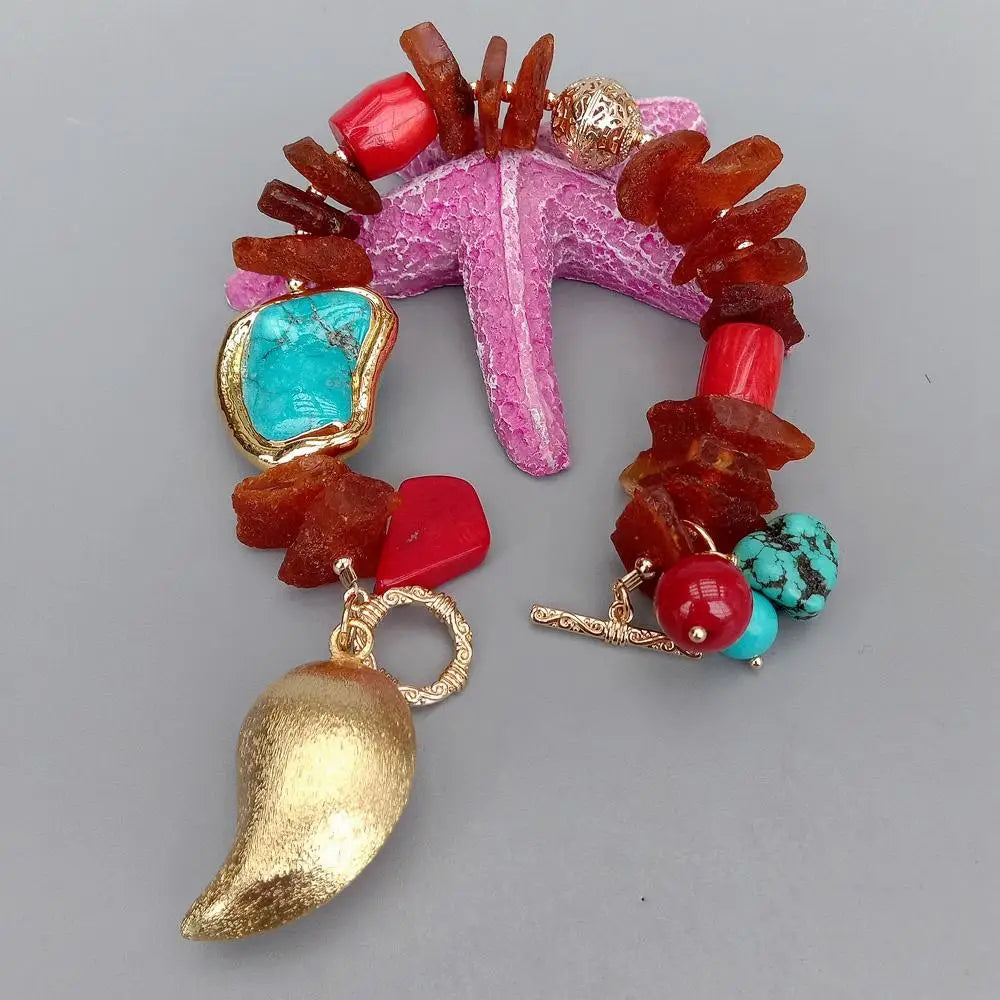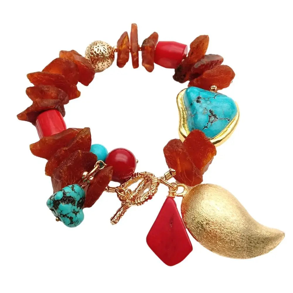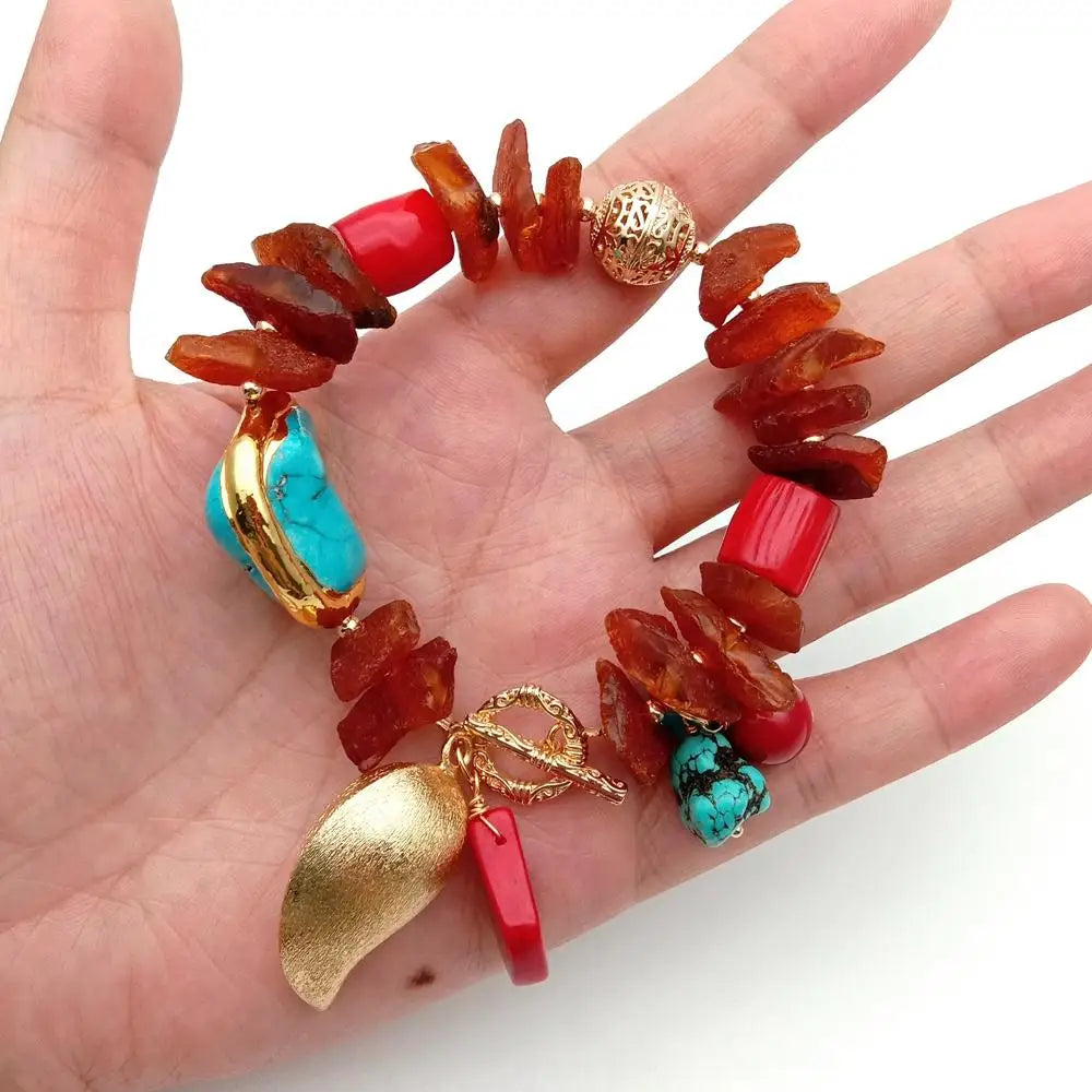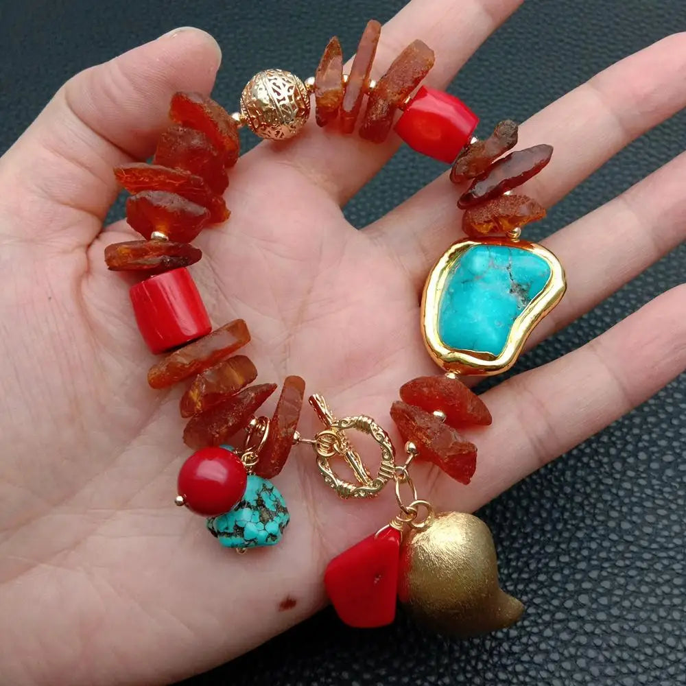 Y.YING Natural Amber Rough Blue Turquoise red coral charm bracelet 8'